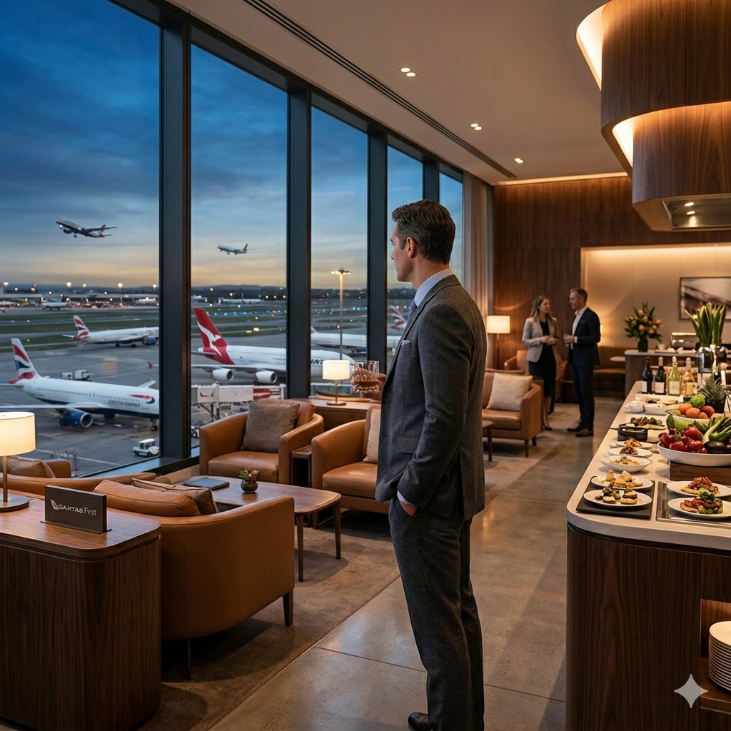The business class lounge experience: hot showers, fine dining, and quiet workspaces — all included before your flight.